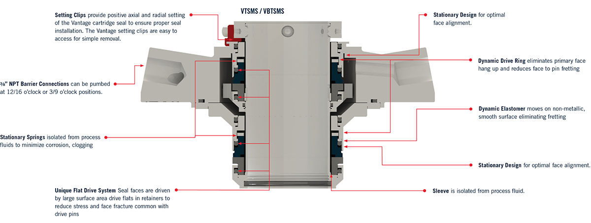 - Vantage tandem seal glands include four (4) barrier in and out connections for maximum piping flexibility.