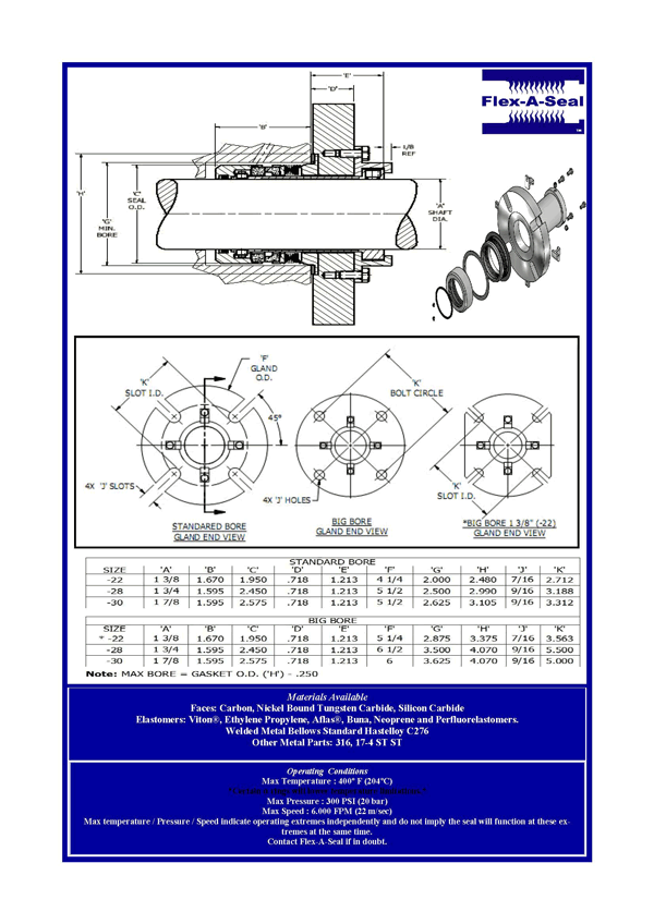 Note: Max Temperature / pressure / speed indicate operating extremes independently and do not imply the seal will function at these extremes at the same time. Contact Flexaseal Engineered Seals and Systems, LLC if in doubt.