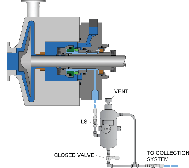 • Leakage is directed from the drain connection in the seal gland into a reservoir resulting in an increase in level of process fluid in the reservoir.