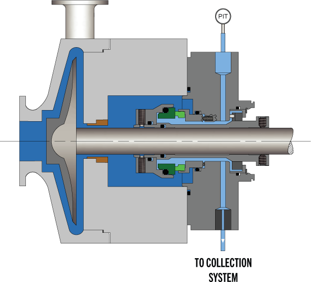 - Pressure in the drain cavity will be monitored by the pressure transmitter and can be used to monitor seal performance and trigger an alarm.