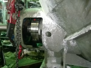 The inboard side came together well with a small gap (1/8” – 1/4”) left between the nose of our shaft sleeve and the nose of bearing housing lip seal retainer ring already in place.