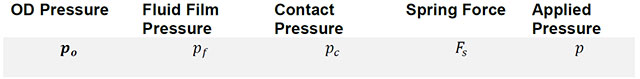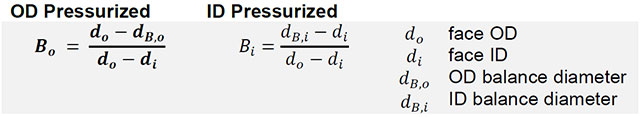 On the front that’s defined by the sealing face (opening area) and in the rear by the secondary sealing diameter, dubbed the balance diameter (closing area). The ratio of closing area to opening area is the seal balance, B, and is also often expressed as a percentage. It represents the fraction of fluid pressure acting to close the seal. To simplify, we take the OD pressure to be the gauge pressure so the ID pressure is zero.