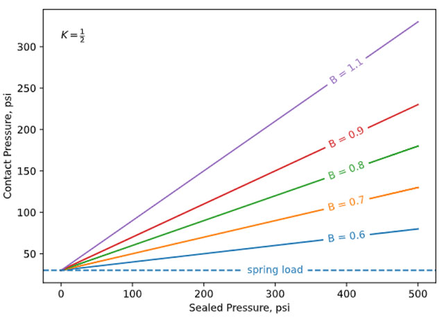 Seal designs are considered unbalanced or balanced. Unbalanced seals have a greater closing area than the seal face (B > 1) and apply more load to the faces than is necessary. Unbalanced seals are simple in design and cheap to manufacture. Balanced seals have a closing area smaller than the seal face—a well designed seal will only apply as little closing force as required for satisfactory long-term seal performance to minimize the face contact pressure. The chart below shows, all else being equal, the big influence balance has on the contact pressure between the faces.