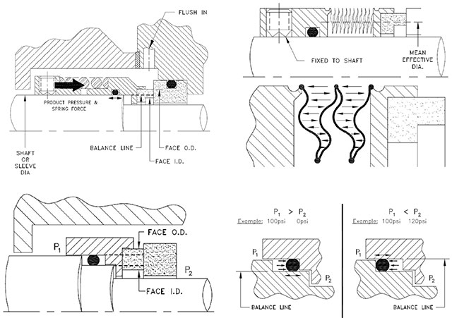 To maintain the required static equilibrium, fluid pressure and spring force applied on the rear of the seal ring is supported on the other end by a mix of fluid film pressure and contact between the two seal faces. Fluid pressure applied on the front and rear faces of the seal ring exerts axial forces that will either open or close the seal faces against each other. Most of the pressure gets “canceled out” (is acting equally on both sides), what matters are the boundaries on either side of the seal ring where pressure is being sealed.
